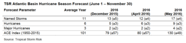Home Breadcrumb caret News Breadcrumb caret Claims Aon Benfield’s Tropical Storm Risk forecasts 17 named storms between June and November Tropical Storm Risk (TSR), which is part of Aon Benfield Research’s academic and industry collaboration, is forecasting 17 named storms, nine hurricanes and four major (Category 3+) hurricanes between the months of June and November. TSR issued its May forecast for the 2016 Atlantic Hurricane Season on May 28. TSR noted in a release that […] By Canadian Underwriter, | May 30, 2016 | Last updated on October 30, 2024 3 min read Plus Icon Image || Tropical Storm Risk (TSR), which is part of Aon Benfield Research’s academic and industry collaboration, is forecasting 17 named storms, nine hurricanes and four major (Category 3+) hurricanes between the months of June and November. TSR issued its May forecast for the 2016 Atlantic Hurricane Season on May 28. TSR noted in a release that the forecast from Professor Mark Saunders and Dr. Adam Lea “is a notable increase from their previous projection.” The projected activity is expected to be 30% above the long-range norm since 1950 and 40% below the recent 2006-2015 norm. The agency also noted that there is “an 80% chance that this will be the most active Atlantic hurricane season since 2012.” The forecast report specifies two primary factors as to why an uptick in the hurricane season forecast has occurred. The main reason is that the North Atlantic Oscillation, which tends to favour warmer sea surface temperatures during the peak development months in August and September, has trended negative in recent months, the release noted. In addition, there is also increasing confidence in the likelihood that La Niña will develop during this time as well. “This would favour lower trade winds, increased vorticity (spin/rotation) and lower vertical wind shear in the main development regions (MDR),” the release noted. “At present, current forecasts for trade winds in the MDR are weaker than normal, while slightly warmer than normal sea surface temperatures are anticipated. Both would favour increased cyclogenesis. However, TSR is quick to remind that forecast skills for these predictors at such a long lead time are just 43 and 47%, respectively.” Drs. Saunders and Lea currently project that there is a 57% probability that the 2016 Atlantic Hurricane Season Accumulated Cyclone Energy Index will be above-average, a 33% likelihood it will be near-normal, and a 10% chance it will be below-normal. The next forecast is expected in late July or early August. Meanwhile, the National Oceanic and Atmospheric Administration (NOAA) has issued its forecast for the 2016 Atlantic and Pacific Hurricane seasons. Forecasters within the U.S. governmental agency are forecasting 10-16 named storms, 4-8 hurricanes and 1-4 major (Category 3+) hurricane(s) between the months of June and November for the Atlantic Basin. This includes January’s Hurricane Alex. NOAA expects 13-20 named storms, 6-11 hurricanes and 3-6 major (Category 3+) hurricanes between mid-May and November for the Eastern Pacific Basin. “NOAA’s report indicates that a near-normal Atlantic Hurricane Season is anticipated in 2016, primarily based on predictions of the main climate factors known to influence seasonal Atlantic hurricane activity, along with model predictions of regional and global atmospheric and oceanic conditions,” NOAA said in a statement. “However, there is a greater-than-normal level of uncertainty at this time. Much of the uncertainty surrounds the Atlantic Multi-Decadal Oscillation (AMO), which is the backdrop that other climate phenomena such as El Niño and La Niña overlay.” NOAA provided the following probabilities for the 2016 Atlantic Hurricane Season: 45% of a near-normal season, 30% chance of an above-normal season and a 25% chance of a near-normal season. For the 2016 Eastern Pacific Hurricane season, NOAA predicted a 40% chance of a near-normal season, 30% chance of an above-normal season, and a 30% chance of a below-normal season. Canadian Underwriter Print Group 8 LinkedIn LI X (Twitter) logo Facebook Print Group 8