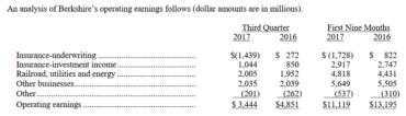 Home Breadcrumb caret News Breadcrumb caret Claims Berkshire Hathaway net earnings drop to US$4.1 billion in Q3, down from US$7.2 billion in Q3 2016 Omaha, Nebraska-based Berkshire Hathaway Inc. has reported net earnings attributable to shareholders of US$4.1 billion for the third quarter of 2017 ending Sept. 30, down from US$7.2 billion in Q3 2016. For the first nine months of the year, net earnings attributable to shareholders were US$12.4 billion, down from US$17.8 billion in 9M 2016, Berkshire […] By Canadian Underwriter, | November 6, 2017 | Last updated on October 30, 2024 2 min read Plus Icon Image | Omaha, Nebraska-based Berkshire Hathaway Inc. has reported net earnings attributable to shareholders of US$4.1 billion for the third quarter of 2017 ending Sept. 30, down from US$7.2 billion in Q3 2016. For the first nine months of the year, net earnings attributable to shareholders were US$12.4 billion, down from US$17.8 billion in 9M 2016, Berkshire Hathaway noted in a press release on Friday. Operating earnings in the third quarter were US$3.4 billion in the most recent quarter compared to US$4.8 billion in Q3 2016. In 9M 2017, operating earnings were US$11.1 billion compared to US$13.2 billion for the same time period last year. Berkshire Hathaway noted in the release that operating earnings in Q3 and 9M 2017 are net of pre-tax underwriting losses of approximately US$3 billion (US$1.95 billion after-tax), attributable to three major hurricanes (Harvey, Irma and Maria) and an earthquake in Mexico. Operating earnings this year were also net of after-tax foreign currency exchange rate losses of US$252 million in Q3 and US$847 million in 9M “related to the revaluation of certain liabilities of Berkshire and its U.S.-based subsidiaries denominated in currencies other than the U.S. dollar.” In 2016, operating earnings included after-tax foreign currency exchange rate losses of US$2 million in Q3 and gains of US$162 million in 9M. Berkshire Hathaway’s insurance-underwriting segment saw a loss of US$1.4 billion, compared to operating earnings of US$272 million in Q3 2016 (US$1.7 billion loss in 9M, compared to operating earnings of US$822 million in 9M 2016). Insurance-investment operating earnings were US$1 billion in the most recent quarter, up from US$850 million in the same quarter last year. For the first nine months of the year, operating earnings were US$2.9 billion, up from US$2.7 billion in the first nine months of 2016, the release added. Railroad, utilities and energy sector third quarter operating earnings were US$2 billion, similar to US$1.95 billion in Q3 2016. For 9M 2017, railroad, utilities and energy sector operating earnings were US$4.8 billion, up from US$4.4 billion in 9M 2016. Other businesses third quarter operating earnings were US$2.035 billion in the most recent quarter, the release said, similar to US$2.039 billion in the third quarter of last year. The “Other” segment saw a loss of US$201 million in Q3 2017 (US$262 million in Q3 2016) and a US$537 loss in 9M 2017 (US$310 million in 9M 2016). Berkshire Hathaway and its subsidiaries engage in diverse business activities including insurance and reinsurance, utilities and energy, freight rail transportation, finance, manufacturing, retailing and services. Canadian Underwriter Print Group 8 LinkedIn LI X (Twitter) logo Facebook Print Group 8