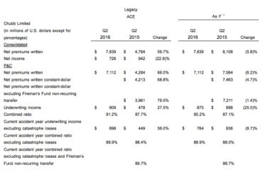 Home Breadcrumb caret News Breadcrumb caret Claims Chubb Limited’s net income for 2016 Q2 down 22.8% from 2015 Q2 Higher natural catastrophe losses globally were among the factors contributing to Chubb Limited reporting US$726 million in net income for the three months ended June 30, 2016 compared to US$942 million for the prior-year quarter. Chubb’s net income was also down when comparing the first half of 2016 to the first half of 2015, with […] By Canadian Underwriter, | July 28, 2016 | Last updated on October 30, 2024 4 min read Plus Icon Image Business graph with abstract numbers and figures|| Higher natural catastrophe losses globally were among the factors contributing to Chubb Limited reporting US$726 million in net income for the three months ended June 30, 2016 compared to US$942 million for the prior-year quarter. Chubb’s net income was also down when comparing the first half of 2016 to the first half of 2015, with the company reporting earlier this week that it was US$1,165 million this year, down 28.2% from US$1,623 million last year. Things were more encouraging with operating income, net of tax. For the second quarter of 2016, Chubb reported operating income of US$1,058 million, up 34.3% from the US$788 million in the second quarter of 2015, the interim results show. Comparing the periods in 2016 and 2015, the statement notes operating income excluding catastrophe losses was US$1,369 million, up from $894 million. “Chubb produced very good operating results in the quarter despite a greater level of industry natural catastrophe losses globally than has occurred in recent years, though industry insured losses appear in line with longer-term historical averages,” says Chubb chairman and CEO Evan G. Greenberg. “For illustrative purposes, excluding the catastrophe losses, operating EPS (earnings per share) for the quarter was up 7% from prior-year, and up 11% for six months, demonstrating the underlying health and earnings power of the new Chubb and depicting the accretive nature of our merger.” In January, ACE Limited announced that it had completed its acquisition of Chubb for about US$29.5 billion in the aggregate in cash and stock. Overall, net premiums written (NPW) amounted to US$7,639 million in the second quarter of 2016 compared to US$4,784 million in the same quarter of 2015, an increase of 59.7%. Looking specifically at Property & Casualty, NPW amounted to US$7,112 million in the quarter ending June 30, 2016 compared to US$4,284 million in the second quarter of 2015, an increase of 66.0%. That contributed to higher underwriting income for the quarter ended June 30, 2016, amounting to US$609 million, which was up 27.5% from the US$478 million in the prior-year quarter. Catastrophe losses again had an effect, with Chubb reporting current accident year underwriting income, excluding Cat losses, was US$698 million in the second quarter of 2016 compared to US$449 million in the same quarter of 2015. The company’s results for the first half of the year, however, was down. Overall, NPW amounted to US$7,639 million for the first six months of the 2016, down 5.8% from US$8,108 million in the first half of 2015. Related: Nat cats in Q2 2016 cost Chubb an estimated US$390 million “Total pre-tax and after-tax catastrophe losses were US$390 million (5.7 percentage points of the combined ratio) and US$311 million, respectively, compared with US$124 million (3.2 percentage points of the combined ratio) and US$106 million, respectively, last year,” note the interim results. “On an ‘as if’ basis, total pre-tax and after-tax catastrophe losses for the second quarter of 2015 were US$274 million (3.9 percentage points of the combined ratio) and US$203 million, respectively,” the interim results add. With regard to P&C, NPW for 2016 H1 was US$7,112 million compared to US$7,584 million, a decrease of 6.2%; underwriting income was US$675 million compared to US$898 million (down 25.0%); and current accident year underwriting income, excluding Cat losses, was US$764 million compared to US$836 million (down 8.7%). For Global P&C (excluding Agriculture), the story was similar for 2016 Q2 and H1 results. NPW for 2016 Q2 was US$6,737 million, up 72.5% from US$3,905 in 2015 Q2; underwriting income was US$595 million, up 30.3% from US$457 million; and current accident year underwriting income, excluding Cat losses, was US$670 million, up 59.7% from US$421 million. For the first half of 2016, however, NPW was US$6,737 million, down 6.5% from US$7,205 million in 2015 H1; underwriting income was US$661 million, down 28.8% from US$877 million; and current accident year underwriting income, excluding Cat losses, was US$736 million, down 8.9% from US$808 million. Looking at North America results specifically, NPW for North America Commercial P&C Insurance was US$3,245 million in the second quarter of 2016 compared to US$1,428 million (a 127.4% increase) while NPW for North America Personal P&C Insurance was US$1,231 million compared to US$547 million (a 125.1% increase). For 2016 and 2015 HI, NPW for Commercial P&C was US$3,245 million compared to US$3,253 (a 0.2% decrease) while NPW for Personal P&C was US$1,231 million compared to US$1,550 million (a 20.6% decrease). “Our earnings were driven, in particular, by strong underwriting margins as reflected in the published P&C combined ratio of 91.2%, or 90.2% excluding purchase accounting and other temporary merger-related items,” Greenberg reports in the company statement. “Premium revenue in the quarter was impacted by foreign exchange, more competitive market conditions and underwriting actions that we took on select portfolios of business,” he says of the three months ending June 30. “These underwriting actions, including greater use of reinsurance, impacted net premium growth in the quarter by about 1.5 points while improving our risk-reward profile.” Related: Chubb Limited’s net income down 35.6% to US$439