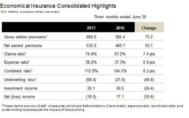 Home Breadcrumb caret News Breadcrumb caret Claims Economical reports 12.8% increase in gross written premiums in Q2 2017, 8.3 point increase in combined ratio to 112.8% Economical Insurance reported a 12.8% increase in gross written premiums (GWP) in the second quarter of 2017 to $660.6 million, driven by strong personal lines growth, including contributions from Sonnet and Petline. “While we generated significant growth in gross written premiums stemming from broker channel personal lines, Sonnet and Petline, the underwriting performance of our […] By Canadian Underwriter, | August 4, 2017 | Last updated on October 30, 2024 4 min read Plus Icon Image | Economical Insurance reported a 12.8% increase in gross written premiums (GWP) in the second quarter of 2017 to $660.6 million, driven by strong personal lines growth, including contributions from Sonnet and Petline. “While we generated significant growth in gross written premiums stemming from broker channel personal lines, Sonnet and Petline, the underwriting performance of our auto lines remains challenged,” Rowan Saunders, president and CEO of Waterloo, Ont.-based Economical, said in a statement on Friday announcing its latest financial results. “To address this, we have implemented a number of targeted rate increases, underwriting and broker management actions, and will continue to strengthen our executive leadership. Further actions are planned through the balance of the year, although they will take time to earn through our results.” The insurer was also impacted by challenging weather conditions, including four separate catastrophe losses from wind and rain events. “The ongoing investments in Sonnet and the replacement of our personal lines policy administration system further contributed to the increase in the combined ratio,” Saunders added. For the three months ending June 30, the combined ratio was 112.8% for the quarter, up 8.3 points from 104.5% in the same quarter last year, including an impact of 6.5 percentage points related to Sonnet and the replacement of the insurer’s personal lines policy administration system. The insurer also generated a net loss of $18.5 million for the quarter, the statement noted. Economical reported that underwriting results were impacted by a continued deterioration in auto performance, primarily in Ontario and British Columbia, which also resulted in adverse prior year claims development in the quarter. The quarter was also affected by the wind and rain storms, which primarily affected the property lines of businesses and contributed 2.7 percentage points to the combined ratio. Year-to-date, underwriting activity was affected by the same factors as the quarter, producing a loss of $106.1 million and resulting in a combined ratio of 110%, compared to an underwriting loss of $27 million and a combined ratio of 102.8% in the same quarter a year ago, the statement said. By line of business, the personal auto combined ratio for the most recent quarter was 117.8%. The adjusted personal auto combined ratio for the second quarter was 106.5%, an 18.4 point increase from 2016, primarily due to continued deterioration in Ontario bodily injury, and British Columbia excess auto liability claims, Economical explained in the statement. The personal property combined ratio for Q2 2017 was 106.8%, with an adjusted combined ratio for personal property of 100.6%. The adjusted combined ratio for the quarter improved 10.1 points from Q2 2016, primarily due to lower levels of weather-related cat losses. Total catastrophe losses decreased, as the same quarter a year ago was heavily impacted by the Fort McMurray wildfire (19.3 percentage points impact), while the current quarter was impacted by 8 percentage points of cat losses stemming from the four separate wind and rain events. Overall, on an adjusted basis, personal lines produced an underwriting loss of $15.8 million compared to an underwriting profit of $16.3 million in the same quarter a year ago. Year-to-date, on an adjusted basis, personal lines produced an underwriting loss of $8.9 million compared to an underwriting profit of $24.4 million in 2016. The commercial auto combined ratio for the second quarter was impacted by a “significant increase” in claims severity in all regions. For the three-month period ending June 30, the commercial auto combined ratio was 115.5%, up 23.8 points from Q2 2016. “To address the deterioration in this line of business, certain targeted rate increases have been implemented in the second quarter,” Economical said in the statement. “Further targeted rate increases and underwriting actions are planned for the second half of 2017.” The commercial property and liability combined ratio for the second quarter of 2017 improved 11.2 points to 105.9% from 117.1%. Cat losses decreased, the statement said, noting that Q2 2016 was impacted by the Fort McMurray wildfire (17.1 percentage points impact), while the current quarter was impacted by 4.1 percentage points of cat losses. There was also an increase in favourable prior year claims development in the second quarter of 2017, which was partially offset by an increase in large losses. Overall, commercial lines produced an underwriting loss of $17.9 million compared to $12.8 million in the same quarter a year ago. Year-to-date, commercial lines produced an underwriting loss of $28.8 million compared to $14.6 million in 2016. Under the new leadership of Saunders in the second quarter of 2017, Economical reported that it initiated a comprehensive review of the commercial line of business portfolio by region and product type. “This ongoing review has identified some early findings, including a range of pricing, underwriting and broker management actions, some of which were swiftly implemented during the second quarter,” the statement said. “While we expect our actions implemented to date and further actions arising from our ongoing review will impact ou