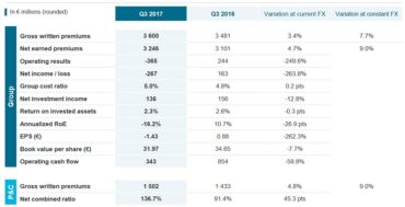 Home Breadcrumb caret News Breadcrumb caret Claims Hurricanes, Mexico earthquakes cost SCOR 430 million euros in Q3 “An exceptional series of large natural catastrophes, with Hurricanes Harvey, Irma and Maria and earthquakes in Mexico,” has led to a cost of 430 million euros, net of retrocession and tax, for SCOR SE for the third quarter of the year. The Paris-based global reinsurer said in a press release on Thursday that the hurricanes […] By Canadian Underwriter, | October 26, 2017 | Last updated on October 30, 2024 2 min read Plus Icon Image | “An exceptional series of large natural catastrophes, with Hurricanes Harvey, Irma and Maria and earthquakes in Mexico,” has led to a cost of 430 million euros, net of retrocession and tax, for SCOR SE for the third quarter of the year. The Paris-based global reinsurer said in a press release on Thursday that the hurricanes and earthquakes resulted in a cost of 598 million euros net of retrocession and pre-tax. As a result, SCOR registered a net loss of 267 million euros in the third quarter of the year, ending Sept. 30, but a net income of 25 million euros for the first nine months of 2017 (versus 438 million euros in 9M 2016). For the third quarter of the year, the combined ratio was 136.7%, up drastically 45.3 points from 91.4% in Q3 2016. For the first nine months of the year, SCOR’s combined ratio was 107.5%, up 14.5 points 93% in 9M 2016. Overall, SCOR reported gross written premiums (GWP) of 3.6 billion euros for most recent quarter, up 3.4% from 3.48 billion euros in Q3 2016. GWP for 9M 2017 were 11.1 billion euros, up 8.9% from 10.2 billion euros in 9M 2016. SCOR said in the release that this growth comes from both Life (+8.7% at constant exchange rates) across all product lines, particularly in the Americas and Asia-Pacific, and from P&C (+10% at constant exchanges rates), leveraging on successful January, April and June renewals, notably in the United States. P&C GWP were 1.5 billion euros in Q3 2017, up 4.8% from 1.43 billion euros in Q3 2016. For 9M 2017, P&C GWP were 4.62 billion euros, up 9.2% from 4.23 billion euros in the first nine months of 2016. Despite the large nat cat events in the third quarter, SCOR reported in that “the in-force retrocession program have responded as expected, demonstrating SCOR’s efficient capital shield policy. SCOR’s retention amounted to approximately 60% of the total gross losses from the five events. If SCOR had had to face the same series of events with Irma being a US$125 billion industry event, there would only have been a marginal net impact on the Group. SCOR’s P&C underwriting capacity remains unaffected by this series of large events.” Denis Kessler, chairman and CEO, commented in the release that the financial results show that “SCOR once again demonstrates its capacity to absorb shocks. The natural catastrophe events that occurred in the third quarter of 2017 are a serious wake-up call for the reinsurance industry and the Group is in a very good position to benefit from the new market environment.” Canadian Underwriter Print Group 8 LinkedIn LI X (Twitter) logo Facebook Print Group 8