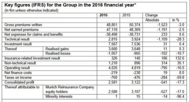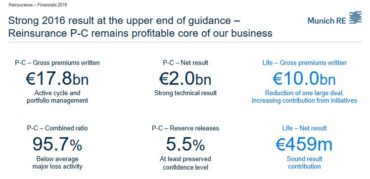 Home Breadcrumb caret News Breadcrumb caret Claims Munich Re operating result down in 2016 from 2015, new partnerships could answer changing client demands Munich Re is looking to set up partnerships that would previously not have been considered, the company reported this week in announcing the group operating result fell 16.5% to 4,025 million euros in 2016 compared to 4,819 million euros in 2015. “The lower technical result and the costs of the ERGO Strategy Programme were only […] By Canadian Underwriter, | March 16, 2017 | Last updated on October 30, 2024 4 min read Plus Icon Image a businessman looking at financial results||| Munich Re is looking to set up partnerships that would previously not have been considered, the company reported this week in announcing the group operating result fell 16.5% to 4,025 million euros in 2016 compared to 4,819 million euros in 2015. “The lower technical result and the costs of the ERGO Strategy Programme were only partly offset by gratifying investment and currency translation results,” Munich Re, which combines primary insurance and reinsurance, notes in a statement Wednesday. Foreign exchange effects had a positive impact of 485 million euros in 2016 compared to a negative impact of 213 million euros in 2015 on the other non-operating result in 2016, the company reports. Also down – although not as much as operating result – was both gross premiums written (GPW) and net earned premiums (NEP), Munich Re figures show. GPW amounted to 48,851 million euros in 2016, down 3.0% from 50,374 million euros in 2015, “mainly because of reduced shares in large-volume treaties, the sale of ERGO Italia, and negative currency translation effects.” With regard to NEP, this was 47,118 million euros in 2016 compared to 48,309 million euros for the prior-year period, a reduction of 2.5%. The investment result, however, was up slightly – 0.4% — to 7,567 million euros in 2016 compared to 7,536 million euros in 2015. For Reinsurance, the field of business contributed 2,484 million euros to the consolidated result in 2016 compared to m 3,261 million euros in 2015. The operating result was down by 1,296 million euros to 2,846 million euros in 2016. GPW were down 1.4% to 27,827 million euros in 2016 compared to 28,216 million euros in 2015. The end result for the segment was a 23.8% decrease to 2,484 million euros in 2016 from 3,261 million euros the previous year. By segment, the Life reinsurance business contributed 459 million euros to the consolidated result in 2016 compared to 345 million euros in 2015. “Claims experience was impacted by high expenditure for single mortality claims with high sums insured, but was. Nevertheless. within the overall range of normal volatility,” Munich Re reports. For Property and Casualty reinsurance, this generated a result of 2,025 million euros in 2016, down from 2,915 million euros in 2015. The combined ratio for 2016 also worsened, amounting to 95.7% of net earned premiums, from 89.7% for the prior year. Munich Re reports that total major-loss expenditure in 2016 was 1,542 million euros compared to 1,046 million euros in 2015, with NEP, major-loss expenditure amounting to 9.1% compared to 6.2% in 2015. The cost of natural catastrophe losses in 2016 was 929 million euros – considerably more than the 149 million euros in 2015 – with the Fort McMurray wildfires, at 404 million euros, “by far the biggest loss of the year for Munich Re.” Other Cats included the earthquake in New Zealand, resulting in losses totalling about 251 million euros; and Hurricane Matthew, costing 232 million euros. Man-made major losses were below the level of the previous year, the company notes, citing a total of 613 million euros in 2015 compared to 897 million euros in 2015. “Competition in reinsurance remains intense,” Torsten Jeworrek, a member of Munich Re’s Board of Management, says in the statement. Noting that Munich Re was able to hold its own, “it withdrew from business that no longer met profit expectations, but was able to expand on or write new profitable business. Overall, Munich Re was mostly able to retain the profitability of its renewed portfolio, and price erosion was only 0.5%,” Jeworrek adds. Nikolaus von Bomhard, chairman of Munich Re’s Board of Management, notes that the company had a profit of 2.6 billion euros in 2016, meeting its most recent forecast of well over 2.3 billion euros. For 2017, Munich Re is aiming for a profit in the range of 2.0 billion euros to 2.4 billion euros “in what is set to be a challenging environment,” von Bomhard points out. “Digitalization is changing client demand, allows for the development of innovative business models, and requires us to set up partnerships that would previously not have been considered,” he reports. Other financial results for 2016 include the following: the Group return on equity amounted to 8.1% compared to 10.0% in 2015; the ERGO field of business reported a loss of 40 million euros in 2016 compared to a loss of 227 million euros in 2015; ERGO had a higher operating result of 1,006 million euros in 2016 compared to 598 million euros in 2015; combined ratio for property-casualty primary insurance in Germany improved to 97.0% in 2016 compared to 97.9% in 2015; Munich Health saw a profit of 137 million euros in 2016 compared to 88 million euros in 2015; Munich Health’s operating result was 173 million euros in 2016 compared to 80 million euros in 2015; Group investment result (excluding insurance-related investments) remained largely stable at 7,567 million euros in 2016 compared to 7,536 million euros in 2015. Overall, the Group is aiming for profit of 2.0 billion to 2.4 billion euros in 2017; the consolidated result in Reinsurance is projected to be 1.8 billion euros to 2.2 billion euros; the technical result for Life and Health Reinsurance should be at least 450 million euros; the goal is a combined ratio of about 97% of NEP fo