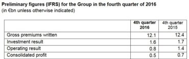 Home Breadcrumb caret News Breadcrumb caret Claims Munich Re posts profit of 2.6 billion euros for 2016; Fort McMurray wildfire cost 404 million euros Munich Re reported on Tuesday a consolidated result of 2.6 billion euros for 2016, including a 0.5 billion euro profit in the fourth quarter of 2016 ending Dec. 31 compared to 0.7 billion euros in the previous year quarter. Munich Re (Group) achieved a “satisfactory” operating result of 4 billion euros in 2016 (4.8 billion […] By Canadian Underwriter, | February 7, 2017 | Last updated on October 30, 2024 4 min read Plus Icon Image || Munich Re reported on Tuesday a consolidated result of 2.6 billion euros for 2016, including a 0.5 billion euro profit in the fourth quarter of 2016 ending Dec. 31 compared to 0.7 billion euros in the previous year quarter. Munich Re (Group) achieved a “satisfactory” operating result of 4 billion euros in 2016 (4.8 billion euros in 2015), of which 0.8 billion were related to the fourth quarter (Q4 2015: 1.4 billion euros), Munich Re said in a press release. “The lower technical result and the costs of the ERGO Strategy Programme were partly offset by gratifying investment and currency translation results,” the release said. In the 2016 financial year, the Group’s gross premiums written (GPW) declined to 48.9 billion euros from 50.4 billion euros in 2015, mainly because of reduced shares in large-volume treaties and the sale of ERGO Italia. The reinsurance field of business contributed 2.5 billion euros to the consolidated result in 2016 compared to 3.3 billion euros in 2015. The operating result was down by 1.3 billion euros to 2.8 billion euros. GPW declined to 27.8 billion last year from 28.2 billion euros. Property and casualty reinsurance generated a “good result” of 2 billion euros over the year as a whole, compared to 2.9 billion in 2015, the release said. The combined ratio for 2016 amounted to 95.7% (89.7% in 2015) of net earned premiums, and totalled 101.9% (Q4 2015: 78.6%) for the fourth quarter. “Munich Re was able to release loss reserves in the amount of €1.1 billion for the full year, and €0.4 billion for the fourth quarter,” the company reported in the release. Adjusted for commission effects, this corresponds to 5.5 percentage points of the combined ratio for the full year and 5.7 percentage points for the fourth quarter. Overall, Munich Re was able to raise the level of loss reserves again slightly in 2016. Total major-loss expenditure for 2016 amounted to 1.5 billion euros in 2016 compared to 1 billion euros in 2015, of which 0.6 billion euros was attributable to the fourth quarter (Q4 2015: 0.2 billion). The major-loss burden amounted to 9.1% (6.2%) of net earned premiums, and remained below the average expected figure of 12% for the full year. However, this does not apply for the fourth quarter, when the ratio totalled 14.8% (Q4 2015: 4.7%), Munich Re reported. Natural catastrophe losses amounted to 0.9 billion euros (0.1 billion euros in 2015) for the full year, while the figure for the fourth quarter was 0.5 billion euros (Q4 2015: 0.0 billion). With a cost of 404 million euros, the Fort McMurray wildfire in May 2016 was the biggest loss of the year. Man-made major losses were below the level of the previous year and totalled 0.6 billion euros last year compared to 0.9 billion euros in 2015, equivalent to 3.6% (2015: 5.3%) of net earned premiums. Development was marked by a variety of individual events, including fire, explosion and liability losses, Munich Re said in the release. As was anticipated in the ERGO Strategy Programme, the ERGO field of business posted a marginal loss of 0.04 billion in 2016 (previous year: loss of 0.2 billion euros). But in the fourth quarter, ERGO generated a profit of 0.07 billion euros, which largely benefited from a high investment result. ERGO GPW declined to 16 billion euros last year versus 16.5 billion euros the previous year. The combined ratio for German property-casualty insurance was 97% (2015: 97.9%) for the full year, and amounted to 100% in the fourth quarter (Q4 2015: 103.9%). The largest loss events in German business were the storms Elvira and Marine/Neele, each of which impacted the result with around 16 million euros. The combined ratio for international property-casualty insurance was 99.0% for the full year (2015: 104.7%), and 100.4% for the fourth quarter (Q4: 115.3%). In the renewals of reinsurance treaties at Jan. 1, 2017, prices fell only slightly in various markets, while demand for reinsurance cover and global capacity remained largely unchanged, the release said. At Jan. 1 of this year, about half of Munich Re’s non-life reinsurance business was up for renewal, representing premium volume of almost 9 billion euros. Of this, 14% (around 1.3 billion euros) was not renewed. By contrast, Munich Re wrote new business with a volume of approximately 1.1 billion euros. The volume of business written at Jan. 1 declined by 4.9% to around 8.5 billion euros. Prices fell by about 0.5%, compared with price erosion of 1% in the previous year. “Munich Re is proceeding on the assumption that the market environment will not change significantly in the subsequent renewal rounds in 2017, unless extraordinary loss events occur,” the release said, noting that the renewal date of April 1 is mainly for reinsurance treaties in Japan, whereas July 1 is the renewal date for the United States, Australia and Latin America. “Market conditions for the renewals were once again challenging, even though the trend towards price reductions had continued to slow,” said Torsten Jeworrek, member of the board of management of Munich Re, in the release. “So skillful cycle management is still extremely important, and Munich Re was once again able to react with flexibility in relation to changes. We withdrew from business that no longer met profit expectations – for instance, in China – and built up or expanded profitable busines