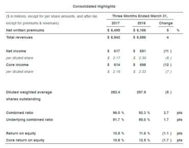 Home Breadcrumb caret News Breadcrumb caret Claims Travelers reports combined ratio of 96% for Q1, net income of US$617 million The Travelers Companies, Inc. has reported a combined ratio of 96% for the first quarter of 2017, up 3.7 points from 92.3% in the first quarter of last year. Net income for the first quarter of 2017 ending March 31 was US$617 million, down from US$691 million in Q1 2016, Travelers said in a statement […] By Canadian Underwriter, | April 20, 2017 | Last updated on October 30, 2024 4 min read Plus Icon Image | The Travelers Companies, Inc. has reported a combined ratio of 96% for the first quarter of 2017, up 3.7 points from 92.3% in the first quarter of last year. Net income for the first quarter of 2017 ending March 31 was US$617 million, down from US$691 million in Q1 2016, Travelers said in a statement issued on Thursday. Core income (formerly referred to as operating income) was US$614 million, compared to US$698 million in the prior-year quarter. Net and core income in both the current and prior-year quarters were impacted by significant catastrophe losses of US$226 million after-tax (US$347 million pre-tax) and US$207 million after-tax (US$318 million pre-tax), respectively. “Core income of US$614 million and core return on equity of 10.8% reflected unusually high first quarter catastrophe losses that arose from a record number of tornado and hail events,” said Travelers’ CEO Alan Schnitzer in the release. “We were pleased with our underlying underwriting results and that loss trends were stable and consistent with our expectations for all of our businesses, including personal auto. Travelers also reported “record” net written premiums (NWP) of US$6.5 billion in the most recent quarter, up 5% (Q1 2016: US$6.17 billion) from the prior-year quarter and reflecting growth in all segments. Total revenues were US$6.94 billion in the most recent quarter, up from US$6.69 billion in Q1 2016. “Net written premiums grew 5% to a record level this quarter, with each business segment contributing to the growth,” Schnitzer continued. “In our commercial businesses, the markets in which we operate remained stable. We continued to achieve historically high levels of retention, and renewal rate change remained positive and improved modestly from recent quarters.” The net income of US$617 million after-tax decreased US$74 million due to lower core income, slightly offset by net realized investment gains in the current quarter as compared to net realized investment losses in the prior-year quarter. Core income of US$614 million after-tax decreased US$84 million, primarily driven by lower net favourable prior-year reserve development that included a $51 million after-tax ($62 million pre-tax) impact from the recent Ogden discount rate adjustment, a lower underlying underwriting gain as explained below and higher catastrophe losses, partially offset by higher net investment income. The current quarter benefited from a US$39 million resolution of prior-year income tax matters, while the prior-year quarter benefited modestly from the favourable settlement of a claims-related legal matter, Travelers reported in the statement. The combined ratio of 96%, which was impacted by significant catastrophe losses as was the prior-year quarter, increased 3.7 points due to lower net favourable prior-year reserve development (1.7 points), a higher underlying combined ratio (1.7 points) and higher catastrophe losses (0.3 points). First quarter segment income for Business and International Insurance in 2017 was US$468 million after-tax, a decrease of US$8 million, primarily driven by a decrease in net favourable prior-year reserve development due to a US$51 million after-tax (US$62 million pre-tax) increase in reserves related to the recent Ogden discount rate adjustment, a lower underlying underwriting gain, partially offset by higher net investment income and modestly lower catastrophe losses as compared to a particularly high level of catastrophe losses in the prior-year quarter. The segment’s combined ratio of 96.3% increased 1.5 points due to a higher underlying combined ratio (1.2 points) and lower net favourable prior-year reserve development (0.7 points), partially offset by lower catastrophe losses (0.4 points), the statement said. Segment income for Bond & Specialty Insurance for the most recent quarter was US$129 million after-tax, a decrease of US$15 million, due to lower net favorable prior-year reserve development, partially offset by the current quarter benefit from a US$17 million resolution of prior-year income tax matters. The combined ratio of 79.3% increased 10 points due to lower net favourable prior-year reserve development. NWP of $504 million grew 2% from the prior year quarter. For Personal Insurance, segment income was US$79 million after-tax, a decrease of US$60 million, primarily driven by a lower underlying underwriting gain, higher catastrophe losses and no net prior-year reserve development compared to net favourable prior-year reserve development in the prior-year quarter, partially offset by higher net investment income. The current quarter also benefitted from a US$7 million resolution of prior-year income tax matters, the statement noted. The segment’s combined ratio of 99.9% increased 6.2 points due to a higher underlying combined ratio (3.4 points), no net prior-year reserve development compared to net favourable prior-year reserve development Q1 2016 (1.4 points) and higher catastrophe losses (1.4 points). NWP of US$1.96 billion increased 12%. Agency Automobile NWP growth of 17% benefitted from the impact of auto rate increases that were consistent with plans to improve profitability and an increase in policies in force of 12% from the prior-year quarter. Agency Homeowners & Other NWP grew 4%, with an increase in policies in force of 4% from the prior-year quarter. Travelers provides auto, home and business insurance. A component of 