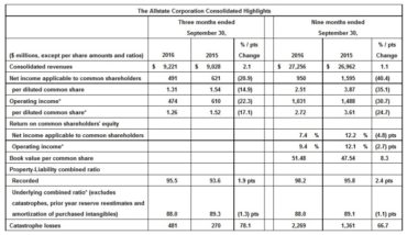 Home Breadcrumb caret News Breadcrumb caret Industry Allstate revenues up 2.1% in Q3 2016 to US$9.22 billion The Allstate Corporation has reported consolidated revenues of US$9.22 billion for the three-month period ending Sept. 30, up 2.1% from US$9.03 billion in Q3 2015. For the first nine months of the year, consolidated revenues were up 1.1% to US$27.3 billion from US$27 billion in 9M 2015, Northbrook, Ill.-based Allstate said in a statement on […] By Canadian Underwriter, | November 4, 2016 | Last updated on October 30, 2024 3 min read Plus Icon Image | The Allstate Corporation has reported consolidated revenues of US$9.22 billion for the three-month period ending Sept. 30, up 2.1% from US$9.03 billion in Q3 2015. For the first nine months of the year, consolidated revenues were up 1.1% to US$27.3 billion from US$27 billion in 9M 2015, Northbrook, Ill.-based Allstate said in a statement on Wednesday. Allstate brand auto written premium growth of 4.1% in the third quarter of 2016 reflected a 7.7% increase in average premium, which more than offset a 2.5% decline in policies in force, the statement said. The recorded combined ratio of 99% in the third quarter of 2016 was 0.2 points higher than the prior-year quarter and was adversely impacted by 3.1 points of catastrophe losses. Allstate brand homeowners net written premium (NWP) declined slightly in the third quarter of 2016 compared to the third quarter of 2015, as average premium increased by 2% while policies in force declined by 0.9%, Allstate reported in the statement. Esurance NWP growth of 5.4% compared to the prior-year quarter reflects a slight decline in policies in force, which was more than offset by a 6.4% increase in auto average premium. The recorded combined ratio of 109.8% was 3.3 points higher in the third quarter of 2016, primarily driven by higher catastrophe losses. Encompass NWP declined by 9.7% and policies in force were 12.6% lower in the third quarter of 2016 compared to the prior-year quarter, “reflecting the continued focus on improving returns in this business,” Allstate said. The combined ratio improved from 101.3% in Q3 2015 to 98.3% in Q3 2016. Allstate Financial net income was US$80 million and operating income was US$94 million in the third quarter of 2016. Operating income was US$44 million lower than the prior-year quarter, primarily due to lower limited partnership income and reduced interest income from the portfolio repositioning in the company’s annuity business. As for net income applicable to common shareholders in the third quarter, Allstate reported US$491 million compared to US$621 million in the third quarter of 2015. Operating income was US$474 million in the third quarter of 2016, compared to US$610 million in the third quarter of 2015. “Net income applicable to common shareholders was US$491 million in the third quarter, reflecting strong profitability from homeowners insurance and an improvement in underlying auto insurance margins,” explained Tom Wilson, chairman and chief executive officer of the Allstate Corporation, in the statement. Property-liability net income of US$483 million was US$46 million higher than the third quarter of 2015. Underwriting income of US$355 million was US$136 million below the prior-year quarter, driven by an increase in catastrophe losses and unfavourable prior-year reserve reestimates in the Discontinued Lines and Coverages segment, partially offset by higher earned premium. “Catastrophe losses increased by US$211 million (78%) in the third quarter and US$908 million (67%) for the first three quarters, which led to a US$457 million decline in year-to-date operating income versus 2015,” Wilson said. “The property-liability underlying combined ratio of 88.0 for the first three quarters was at the favourable end of our annual outlook range of 88 – 90.” “Results on our five operating priorities for 2016 also reflect a balanced approach to adapting to the external environment,” Wilson concluded. The Allstate Corporation is the largest publicly held personal lines insurer in the United States, providing coverage to approximately 16 million households through auto, home, life and other insurance. Canadian Underwriter Print Group 8 LinkedIn LI X (Twitter) logo Facebook Print Group 8