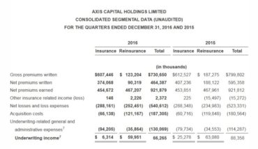 Home Breadcrumb caret News Breadcrumb caret Industry AXIS Capital reports net income of US$131 million for Q4 2016 Pembroke, Bermuda-based AXIS Capital Holdings Limited has reported a net income available to common shareholders for the fourth quarter of 2016 of US$131 million, comparable to a net income of US$135 million for the fourth quarter of 2015. Net income available to common shareholders for the full year 2016 was US$465 million, down from $602 […] By Canadian Underwriter, | February 6, 2017 | Last updated on October 30, 2024 4 min read Plus Icon Image | Pembroke, Bermuda-based AXIS Capital Holdings Limited has reported a net income available to common shareholders for the fourth quarter of 2016 of US$131 million, comparable to a net income of US$135 million for the fourth quarter of 2015. Net income available to common shareholders for the full year 2016 was US$465 million, down from $602 million in 2015, AXIS Capital said in a press release last week. The net income available to common shareholders for the full year 2015 included US$280 million of termination fees received following the termination of the amalgamation agreement with PartnerRe Ltd. as well as reorganization and related expenses of US$46 million, Axis Capital reported in the release from Feb. 1. For the fourth quarter of last year, ending Dec. 31, the combined ratio was 96.7%, compared to 91.6% in the same quarter of 2015. For the full year, the combined ratio was 95.9%, compared to 94.7% for the full year of 2015. By segment, the Insurance segment reported gross premiums written (GPW) of US$607 million in Q4 2016, a decrease of 1% from US$613 million of GPW in the corresponding quarter of 2015. After adjusting for the impact of foreign exchange movements, the growth was attributable to increases in liability, property, and professional lines driven by new business, AXIS Capital said in the release, adding that these increases were partially offset by decreases in credit and political risk, as well as accident and health lines. For the full year 2016, the Insurance segment reported GPW of US$2.7 billion, an increase of 5% from US$2.6 billion of GPW in 2015. After adjusting for the impact of foreign exchange movements, the growth was attributable to increases in accident and health, property, liability and professional lines, primarily driven by new business. These increases were partially offset by the impact of the exit from retail insurance operations in Australia last year as well as a decrease in premiums written in marine lines. The decrease in marine lines was driven by reduced business opportunities, lower rates, and timing differences, AXIS Capital said in the release. Insurance segment net premiums written (NPW) decreased by 8% in Q4 2016, compared to the same period in 2015, reflecting lower GPW in the quarter and increased premiums ceded in the company’s professional and liability lines. For the full year 2016, NPW increased by 3% compared to 2015, driven by growth in premiums written, partially offset by an increase in premiums ceded in professional and liability lines. Regarding the company’s Reinsurance segment for the fourth quarter of 2016, GPW decreased 34% to US$123 million from US$187 million in the corresponding quarter of 2015. The decrease was impacted by a lower level of premiums written on a multi-year basis during 2016 compared to 2015, most notably in liability lines. The decrease was driven by professional lines of business, partially offset by an increase in agriculture lines. “The decrease in our professional lines related to the restructuring of a large quota share treaty which impacted the timing of premium recognition,” the release said. “The increase in our agriculture lines was driven by the impact of favourable premium adjustments.” For the full year 2016, the Reinsurance segment reported GPW of US$2.2 billion, an increase of 11% from US$2 billion of GPW in 2015. The increase was impacted by a higher level of premiums written on a multi-year basis during 2016, compared to 2015, most notably in credit and surety as well as liability lines. Partially offsetting this increase was the impact of foreign exchange movements, as the strengthening of the U.S. dollar drove comparative premium decreases in treaties denominated in foreign currencies. The growth was attributable to increases in liability, marine and other, catastrophe, agriculture, motor, and credit and surety lines, primarily driven by new business. Timing differences in liability lines, a favourable treaty restructuring together with increased line sizes in our agriculture lines and favourable premium adjustments in credit and surety lines also contributed to the increase in GPW in 2016, AXIS Capital said. These increases were partially offset by a decrease in property lines, primarily relating to non-renewals, decreases in line sizes on several treaties, and the restructuring of a large treaty. Reinsurance NPW decreased by 52% in the fourth quarter of 2016, compared to the same period in 2015, reflecting the decrease in GPW in the quarter and the impact of a retrocessional cover entered into with Harrington Re Ltd. in Q3 2016, which increased premiums ceded in liability and professional lines. For the full year 2016, NPW increased by 2% compared to 2015, reflecting the increase in GPW, partially offset by the impact of the retrocessional cover with Harrington Re Ltd. as well as an increase in premiums ceded in catastrophe and property lines. Commenting on the financial results, Albert Benchimol, president and CEO of AXIS Capital, said in the release that “the strength of our operating results in the fourth quarter – which included Hurricane Matthew and other U.S. weather-related events, and 11% growth in our full-year operating earnings per share despite continued market pressure and elevated global cat losses – demonstrates the progression of our initiatives to deliver a more stable and growing earnin
