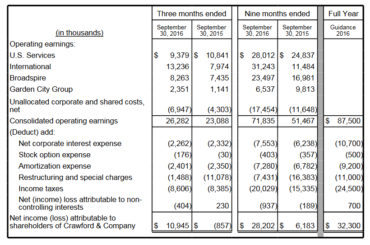 Home Breadcrumb caret News Breadcrumb caret Industry Crawford & Company reports net income of US$10.9 million in Q3 2016 compared to net loss of US$0.9 million in Q3 2015 Independent claims provider Crawford & Company announced on Monday net income attributable to shareholders of US$10.9 million in the third quarter of 2016 ending Sept. 30 compared to a net loss of US$0.9 million in the same period last year. Atlanta, Ga.-based Crawford & Company, one of the world’s largest independent providers of claims management […] By Canadian Underwriter, | November 7, 2016 | Last updated on October 30, 2024 3 min read Plus Icon Image | Independent claims provider Crawford & Company announced on Monday net income attributable to shareholders of US$10.9 million in the third quarter of 2016 ending Sept. 30 compared to a net loss of US$0.9 million in the same period last year. Atlanta, Ga.-based Crawford & Company, one of the world’s largest independent providers of claims management solutions to insurance companies and self-insured entities, noted that all four business segments achieved double digit operating margins this quarter. U.S. Services revenues before reimbursements were US$56.5 million in the third quarter of 2016, decreasing 9% from $62.1 million in the third quarter of 2015, Crawford said in a press release. The revenue decrease was primarily due to a reduction in U.S. Catastrophe Services, partially offset by an increase in U.S. Contractor Connection revenues. Operating earnings were US$9.4 million in the 2016 third quarter, compared with US$10.8 million in the third quarter of 2015, representing operating margins of 17% in both the 2016 and 2015 periods, Crawford said. Third quarter 2016 revenues before reimbursements for the International segment totalled US$121.6 million, compared to US$128.2 million in the 2015 third quarter. This decrease was primarily due to changes in foreign exchange rates, which negatively impacted revenues by approximately 5%, or US$6.1 million, in the third quarter compared with the prior year period. International segment operating earnings were US$13.2 million in the 2016 third quarter, compared with US$8 million in the 2015 third quarter. The segment’s operating margin was 11% in the 2016 period as compared to 6% in the 2015 period. The increase in operating margin for the 2016 quarter was a result of improvements in all major operating regions and the benefits of cost reduction initiatives implemented in 2015. Broadspire segment revenues before reimbursements were US$76.7 million in the 2016 third quarter, up from US$74.2 million in the 2015 third quarter. The revenue increase was due to increased claims and medical management revenues and higher average case values when compared with the 2015 period, Crawford reported. Broadspire, a third party administrator, recorded operating earnings of US$8.3 million in the third quarter of 2016, representing an operating margin of 11%, compared with US$7.4 million, or 10% of revenues, in the 2015 third quarter. Revenues before reimbursements for Garden City Group, a provider of legal administration services for class action settlements, bankruptcy cases and legal noticing programs, were US$22.5 million in Q3 2016, compared to US$28.8 million in the same period of 2015. “The expected decrease in revenues was primarily due to declines in volumes associated with certain large cases which are transitioning to conclusion,” Crawford said in the release. Operating earnings were US$2.4 million in the 2016 third quarter as compared to US$1.1 million in the 2015 period. The segment’s operating margin for the 2016 quarter was 10% as compared to 4% for the 2015 period as a result of the impact of cost reduction initiatives implemented earlier in 2016. At Sept. 30, 2016 there was a backlog of projects awarded totalling approximately $94 million as compared to $76 million at Sept. 30, 2015. “Our third quarter results are a clear indication that the strategic initiatives implemented beginning over a year ago are unlocking the potential that exists at Crawford as we strive to deliver more predictable financial results regardless of the market backdrop,” said Harsha V. Agadi, chief executive officer of Crawford, in the release. “While the environment remained challenging once again this quarter, we achieved our best performance of the year as operating earnings grew 14%, year over year, driven by 160 basis points of margin expansion. Importantly, all four of our business segments generated double digit operating margins this quarter.” Agadi said that while operating earnings have expanded by 40% year-to-date, “we believe significant untapped potential remains across our global operations. We will continue to evaluate our business segments as we strive to deliver revenue growth and further operational improvements in order to remain competitive and relevant in this ever-changing world.” Canadian Underwriter Print Group 8 LinkedIn LI X (Twitter) logo Facebook Print Group 8
