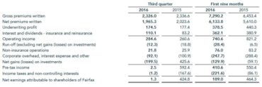 Home Breadcrumb caret News Breadcrumb caret Industry Net earnings for Fairfax Financial Holdings Limited US$1.3 million in 2016 Q3 compared to US$424.8 million in 2015 Q3 Net losses on investment contributed to Fairfax Financial Holdings Limited seeing net earnings drop to US$1.3 million in 2016 Q3 compared to US$424.8 million in 2015 Q3. The results reflect “strong operating income offset by net losses on investments,” notes a statement last week from the company. Fairfax Financial Holdings is a holding company which, […] By Canadian Underwriter, | November 7, 2016 | Last updated on October 30, 2024 4 min read Plus Icon Image Business graph with abstract numbers and figures|| Net losses on investment contributed to Fairfax Financial Holdings Limited seeing net earnings drop to US$1.3 million in 2016 Q3 compared to US$424.8 million in 2015 Q3. The results reflect “strong operating income offset by net losses on investments,” notes a statement last week from the company. Fairfax Financial Holdings is a holding company which, through its subsidiaries, is engaged in property and casualty insurance and reinsurance and investment management. These include Northbridge Insurance, Odyssey Reinsurance Company, Crum & Forster, Zenith National, Brit Insurance and Fairfax Asia. “Net losses on investments of US$200 million were primarily as a result of price fluctuations in stocks and our CPI-linked derivative contracts,” Prem Watsa, chairman and CEO of Fairfax Financial Holdings, says in the statement. For the first nine months of the year, the company reports, net earnings were US$189.0 million in 2016 compared to US$464.4 million in 2015. Operating income for the insurance and reinsurance operations (excluding net gains or losses on investments) was up in 2016 Q3 compared to 2015 Q3, amounting to US$284.6 million compared to US$260.6 million. This reflects “an increase in interest and dividends and share of profit of associates,” the statement notes. Year to date, however, Fairfax Financial Holdings’ operating income was US$740.6 million in 2016, down from US$821.2 million. Overall, gross premiums written (GPW) in the third quarter of 2016 amounted to US$2,326.0 million, just slightly below the US$2,336.6 million in the prior-year quarter, while year to date, GPW was US$7,290.2 million in 2016 compared to US$6,453.4 million in 2015. For net premiums written (NPW), these, again, were in line when comparing 2016 Q3 and 2015 Q3. NPW was US$1,965.3 million for the third quarter of 2016 compared to US$2,023.6 million for the prior-year quarter. Figures were more positive year to date, with NPW increasing to US$6,133.8 million in 2016 compared to US$5,610.0 million in 2015. That said, underwriting profit was down, both when comparing Q3 and for the first three quarters of the year. Underwriting profit in 2016 Q3 amounted to US$174.5 million compared to US$177.4 million 2015 Q3; year to date, it was US$378.5 million in 2016 compared to US$440.3 million in 2015. Looking at the company’s insurance and reinsurance operations, NPW totalled US$1,965.4 million in 2016 Q3, up 4.4% from US$1,883.3 million in 2015 Q3 (this primarily reflected growth at Crum & Forster, Northbridge and Zenith National). Year to date, NPW was US$6,063.0 million in 2016 compared to US$5,323.2 million in 2015. It was a mixed bag – in terms of increases and decreases – when looking at NPW and net premiums earned (NPE). For example, in the third quarter of 2016, Northbridge saw NPW of US$228.2 million compared to US$201.4 million in the third quarter of 2015; OdysseyRe saw NPW of US$499.0 million compared to US$508.7 million; and Brit saw US$404.8 million compared to US$411.7 million. For NPE, the total was US$2,000.8 million in the third quarter of 2016 compared to US1,907.2 million in the third quarter of 2015. Year to date, NPE was US$5,708.0 million in 2016 compared to US$5.048.8 million in 2015. Specifically, Northbridge saw NPE of US$239.5 million compared to US$224.1 million; OdysseyRe saw US$557.0 million compared to US$560.3 million and Brit saw US$335.0 million compared to US$368.3 million. With regard to investments, net losses amounted to US$199.5 million in 2016 Q3 compared to net gains of US$425.6 million in 2015 Q3, the statement notes. For the first nine months of the year, Fairfax Financial Holdings saw net losses of US$129.9 million in 2016 compared to net losses of US$59.1 million in 2015. In 2016, Fairfax Financial Holdings came to a number of agreements, including the announcement to acquire a 100% interest in Zurich Insurance Company South Africa Limited for US$129 million, completing a previously announced acquisition of an interest in Eurolife ERB Insurance Group Holdings S.A. for US$181 million, and agreeing to acquire from AIG insurance operations in Argentina, Chile, Columbia, Uruguay, Venezuela and Turkey and certain assets and renewal rights with respect to AGI business written in eastern Europe, with total consideration being US$240 million. Related: Fairfax Financial agrees to buy Zurich’s South Africa and Botswana insurance operations “The company has sold approximately 90% of the U.S. long term treasuries in its investment portfolios; as a result, its cash and short term investments will be in excess of US$10 billion,” the company reports. “Our insurance companies continued to have excellent underwriting performance in the third quarter and the first nine months of 2016 with a consolidated combined ratio of 91.3% and 93.4%, respectively,” Watsa says in the statement. “We are maintaining our defensive equity hedges and deflation protection as we remain concerned about the financial markets and the economic outlook in this global deflationary environment,” Watson reports. That said, “we continue to be soundly financed, with quarter-end cash and marketable securities in the holding company over $1.1 billion,” he adds. Canadian Underwriter Print Group 8 LinkedIn LI