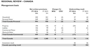 Home Breadcrumb caret News Breadcrumb caret Industry RSA Group reports record 2016 underwriting profit of 380 million pounds and record combined ratio of 94.2% RSA Group has reported a record Group underwriting profit of 380 million pounds for 2016 – up 73% from 220 million pounds in 2015 – and a record Group combined ratio of 94.2% compared to 96.9% in 2015. RSA also reported in its financial results released on Thursday a Group operating profit of 655 million […] By Canadian Underwriter, | February 24, 2017 | Last updated on October 30, 2024 3 min read Plus Icon Image | RSA Group has reported a record Group underwriting profit of 380 million pounds for 2016 – up 73% from 220 million pounds in 2015 – and a record Group combined ratio of 94.2% compared to 96.9% in 2015. RSA also reported in its financial results released on Thursday a Group operating profit of 655 million pounds last year, up 25% from 523 million pounds in 2015: Scandinavia at 311 million pounds, Canada at 140 million pounds and the United Kingdom at 259 million pounds. The Core Group combined ratio for 2016 for Scandinavia was 86.2%, 94.9% for Canada and 95.4% for the U.K. RSA further noted a record Group current year underwriting profit of 271 million pounds last year compared to 129 million pounds in 2015. The Core Group attritional loss ratio was 1.4 points better than last year, while weather and large losses 0.3 points worse, RSA said in a statement. Group prior year underwriting profit was 109 million compared to 91 million in 2015. Core Group premiums were up 6% for the year to 6.3 billion pounds. Total Group net written premiums (NWP) for full year 2016 were 6.4 billion pounds, down from 6.8 billion pounds in 2015. By jurisdiction, NWPs for 2016 were 1.72 billion pounds for Scandanavia, 1.44 billion pounds for Canada, 3.1 billion pounds for UK & International at 36 million pounds for “Central functions.” Regional trends for 2016 included Canadian premiums up 6%, though down 3% at constant fx with Personal down 4% and Commercial flat, “reflecting underwriting discipline in competitive market conditions,” the statement said. Looking at Canada specifically, Household NWP were 445 million pounds for 2016, up from 421 million pounds in 2015, while Personal Motor NWP were 549 million pounds last year, up from 529 million pounds in 2015. Canadian Property NWP for last year were 194 million pounds, up from 176 million pounds in 2015; Liability NWP were 102 million pounds for 2016 compared to 99 million pounds in 2015; Commercial Motor NWP were also 102 million pounds, up from 85 million pounds in 2015; Marine & Other NWP were 51 million pounds, similar to 50 million pounds in 2015. Total Commercial NWP for Canada were 449 million pounds, up from 410 million pounds in 2015. “We have had a strong and resilient year in Canada, absorbing our share of losses from Fort McMurray, the largest natural catastrophe in Canadian history, yet still delivering an underwriting profit of 74 million pounds and [combined operating ratio] of 94.9%,” the statement said. However, conditions in Canada still remain competitive, particularly in the commercial broker channel, RSA noted, saying that its priority “continues to be on sustained underwriting discipline.” Overall, Canadian personal premiums were down 4%, driven by rate reductions in Personal Motor and lower volumes. “Premium reduction trends have been gradually moderating and Q4 2016 saw flat premiums overall.” The statement noted that the Canadian underwriting profit for the year of 74 million pounds (compared to 116 million pounds in 2015) “was in line with our expectations, even after absorbing the impact of the Fort McMurray wildfire losses in May where our reinsurance programme limited our exposure to a net claims cost of 42 million pounds. The weather ratio was therefore elevated at 5.7% (1.4 points worse that long term averages). Large losses were higher than expected at 6.4%, driven by a small number of large claims in Commercial Property.” Speaking about RSA’s results overall, Stephen Hester, Group chief executive, said in that statement that “in 2016, RSA took major strides forward, moving seamlessly from ‘successful turnaround’ to organic outperformance. Our ambition now is to drive RSA’s performance towards ‘best in class’ levels. Industry and financial market conditions will remain tough. We plan to outperform through continuing self-help measures on customer service, underwriting and costs.” Canadian Underwriter Print Group 8 LinkedIn LI X (Twitter) logo Facebook Print Group 8