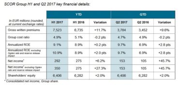 Home Breadcrumb caret News Breadcrumb caret Industry SCOR posts net income of 292 million euros for the first half of 2017 French reinsurer SCOR has reported a net income of 292 million euros for the first half of the year, up from 275 million euros in the first half of 2016. The company’s net combined ratio in P&C was 93.5% for the first six months of the year, ending June 30, down 0.3% from 93.8% in […] By Canadian Underwriter, | July 27, 2017 | Last updated on October 30, 2024 2 min read Plus Icon Image | French reinsurer SCOR has reported a net income of 292 million euros for the first half of the year, up from 275 million euros in the first half of 2016. The company’s net combined ratio in P&C was 93.5% for the first six months of the year, ending June 30, down 0.3% from 93.8% in the first half of last year, SCOR said in a statement on Thursday. P&C gross written premiums (GWP) for H1 2017 were 3.12 billion euros, up 11.4% from 2.80 billion euros in H1 2016. Group GWPs for the first half of this year were 7.52 billion euros, up from 6.74 billion euros in H1 2016, while GWP for the Global Life segment were 4.40 billion euros in H1 2017 compared to 3.93 billion euros in H1 2016. By quarter, GWP for the second quarter of 2017 ending June 30 were 3.78 billion euros, compared to 3.45 billion euros in Q2 2016. Net income for the quarter was 153 million euros, up 45.7% from 105 million euros in the second quarter of 2016. According to the SCOR statement, profitability in the first half of the year was driven by low natural catastrophe losses and “roughly flat net attritional losses and commissions net of Ogden” – the United Kingdom government’s decision to cut personal injury discount rate to -0.75% from 2.5%. Cat events totalled 2.1 points of net combined ratio on a year-to-date basis, SCOR reported in the statement, including storm & fire in South Africa (15 million euros), Tropical Cyclone Debbie (20 million euros) and an earthquake in Australia (9 million euros) as the main events. For Ogden, the attritional loss and commission ratio was 84.7% for H1 2017, similar to the first half of last year (79.9%) when excluding the impact of the change in the Ogden rate (4.3 points), which was fully taken into account in Q1 2017. SCOR also reported that P&C renewal outcomes in June and July are line with the reinsurer’s “Vision in Action.” Gross renewed premiums grew by 4.7% at constant exchange ratios to 547 million euros, driven by Credit & Surety and EMEA (Europe, the Middle East and Africa). Overall, pricing at the June/July renewals declined -0.5%, driven by property, with the year-to-date price change remaining at -0.5%. For SCOR Global Life, GWP stood at 4.40 million euros, up 9.7% at constant exchange rates compared to the same period last year. According to the statement, this was driven by “robust new business flow across all product lines,” strong growth in Asia Pacific and longevity business expansion in the U.K., with a new deal underwritten in the second quarter of 2017. SCOR also launched a share buy-back program on Thursday, for an amount of up to 200 million euros over the next 24 months. Canadian Underwriter Print Group 8 LinkedIn LI X (Twitter) logo Facebook Print Group 8