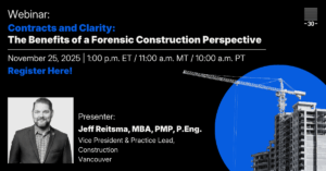 Home Breadcrumb caret Partner Content Breadcrumb caret Announcements Breadcrumb caret Events Contracts & Clarity: The Benefits of a Forensic Construction Perspective WEBINAR By -30- Forensic Engineering | November 17, 2025 | Last updated on November 17, 2025 2 min read Plus Icon Image Please join Jeff Reitsma MBA, PMP, P.Eng., 30 Forensic Engineering’s Vice President and Construction Practice Lead, for a dynamic discussion on emerging trends and themes from recent forensic files, focusing on standards of care on construction projects. This insightful webinar will be of particular interest to practitioners in the insurance industry, including adjusters and examiners, contractors, and lawyers involved on both sides of construction-related litigation. Nov 25, 2025 | 1:00 PM ET | 11:00 AM MT | 10:00 AM PT Click HERE and Register Today. Topics will include: The importance of good contracts; Realties related to change & delay management; and, Performance management expectations in construction. Jeff is a Vice President at 30 Forensic Engineering and Practice Lead of the Construction group, with over 20 years of experience in the engineering consulting and construction industries. Jeff specializes in project management of multidisciplinary investigations and reconstruction projects nationwide and has led teams for some of the biggest engineering firms in North America. He has overseen municipal capital infrastructure projects from conception to completion and designed and directed environmental assessment works involving indoor air quality, chemical engineering, mould, asbestos, and fire and flood impact mapping. Jeff is an ODACC-Registered adjudicator supporting dispute resolution under the Construction Act in Ontario. In his role as Practice Lead, Jeff provides leadership to multidisciplinary engineering teams and manages both small scale forensic investigations and large-scale remediation, environmental, construction claims, and CAT Loss projects. About 30 Forensic Engineering 30 Forensic Engineering is one of Canada’s largest multidisciplinary forensic firms, with offices in Vancouver, Calgary, Toronto and Ottawa. Our core team of over 100 professional engineers, experts, investigators, engineering technicians and support staff is enhanced through relationships with some of the top scientists, standard-makers and specialized consultants in North America supporting clients across multiple sectors and industries including: Environmental | HealthCare | Hospitality | Infrastructure | Insurance | Legal | Manufacturing | Renewable Energy | Commercial & Residential Property | Construction We provide world-class engineering and consulting expertise in: Biomechanics & Personal Injury | Building & Fire Code | Building Science & Building Envelope | Civil & Structural Engineering | Collision Reconstruction | Construction | Digital Media Analysis | Energy & Power | Fire & Electrical | Geotechnical Engineering | Human Factors | Materials & Product Failure | Occupational Health & Safety | Remediation | Special Investigation | Transportation | Winter Road Maintenance To meet the people behind 30 Forensic Engineering please click HERE. -30- Event Details: Start Date: 25/11/2025 End Date: 25/11/2025 Address: WEBINAR Website: https://us06web.zoom.us/webinar/register/WN_yySEOQvvQ26pUkZgSziX9A#/registration Subscribe to our newsletters Subscribe Subscribe -30- Forensic Engineering
